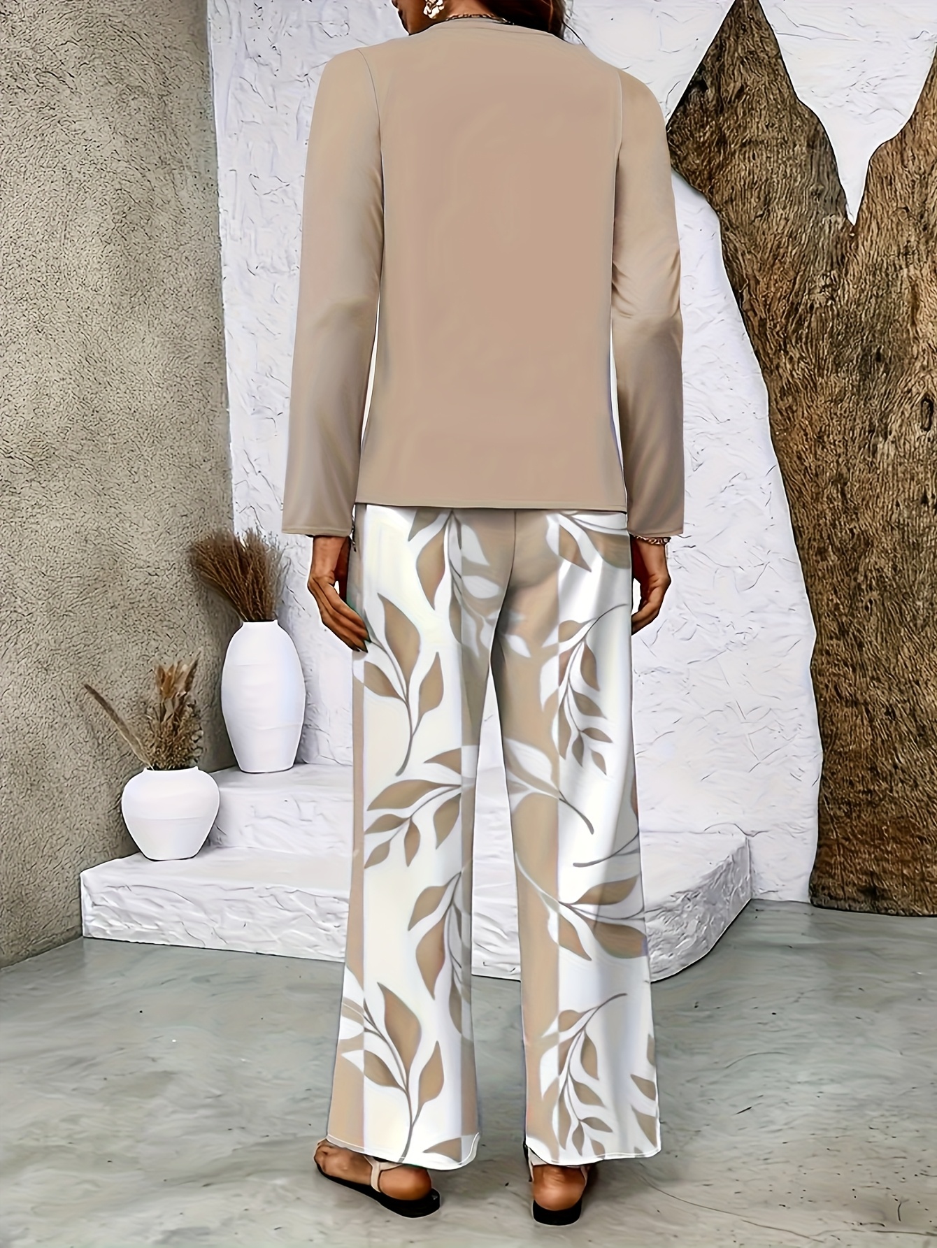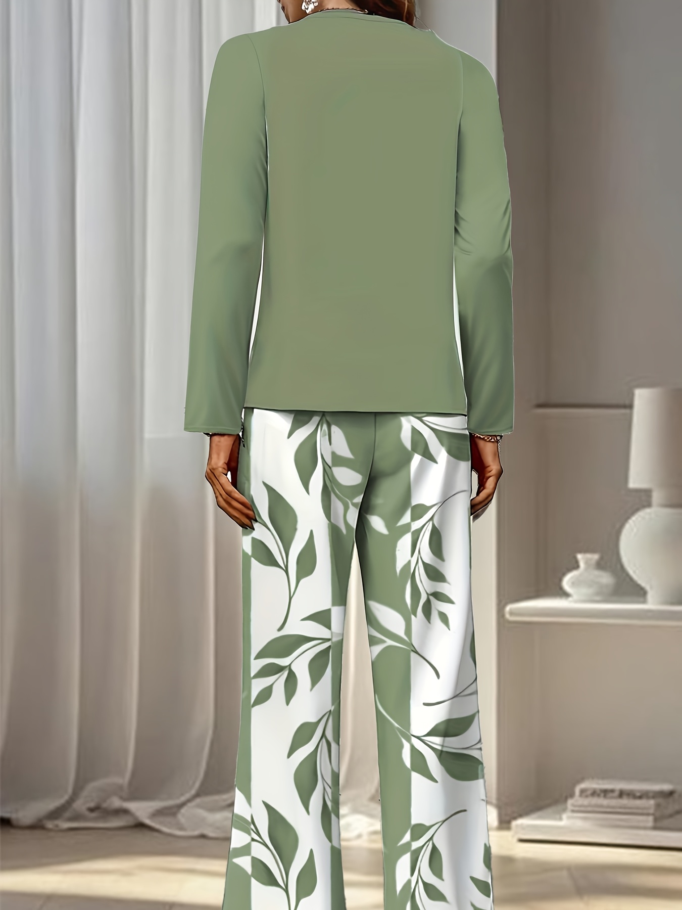 New Development: Plant Striped Printed Square Collar Double-layer Design, Long Sleeved Top, Straight Leg Pants Two-piece Set, Casual And Comfortable Long Sleeved Suit